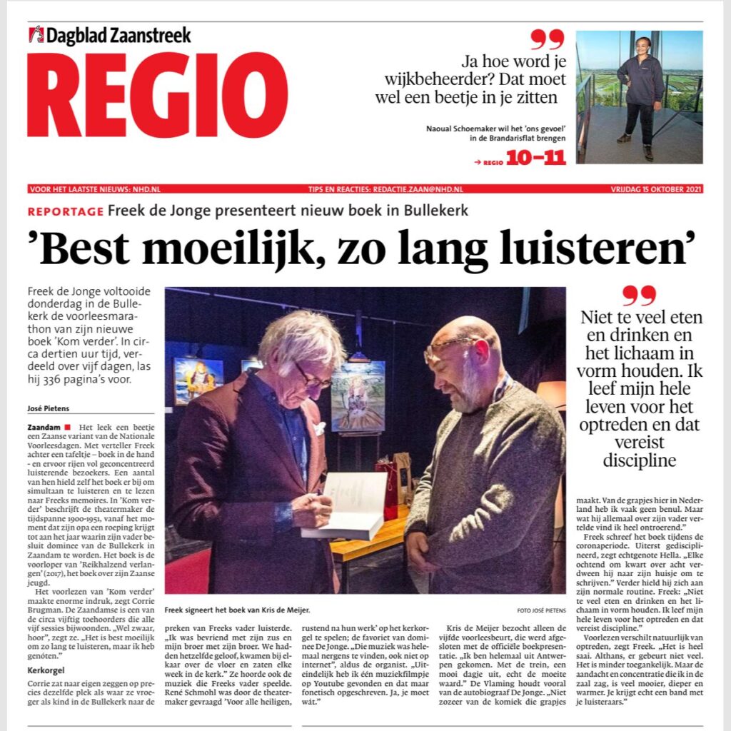 Op donderdag 14 oktober kwamen meerdere werelden samen in de Bullekerk in Zaandam. Freek las het laatste deel van zijn nieuwe boek ‘Kom verder!’ voor. Het sluitstuk van 5 middagen (11 uur lezen!), waarin hij het hele boek voorlas voor een aandachtig publiek.