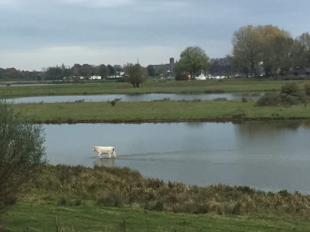 Ik heb altijd moeite om opeens ver boven de door mij verwachte aankomsttijd te arriveren. Dat dreigde diverse keren, maar het vooruitzicht van het pontje hield me op de been en toen ik opeens een witte koe door de uiterwaarden zag waden, kwam er een rust over mij die een reisleider moeten voelen als hij een bus vol geheel verzorgde gezichten ziet.