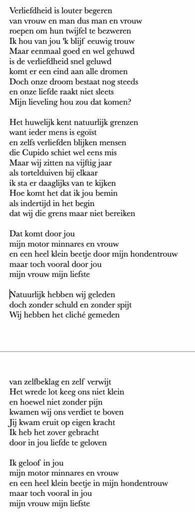 Na afloop van de voorstelling droeg ik met Hella aan mijn zijde op het toneel het op Jacques Brels Chanson Des Vieux Amants geïnspireerde Lied Van De Oude Geliefden voor.