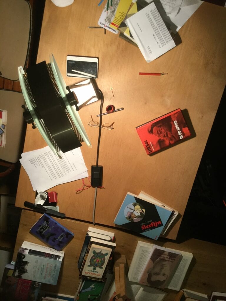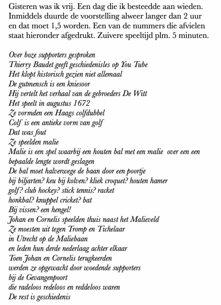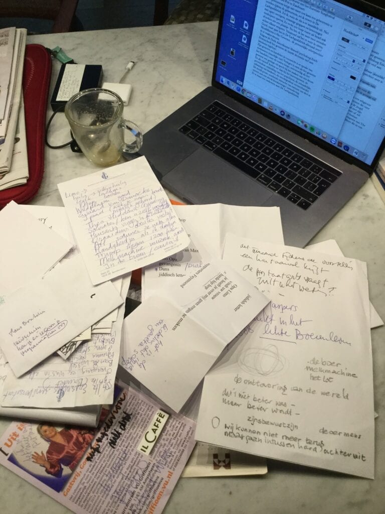 Niet veel meer dan het voorlezen van wat ik de afgelopen weken genoteerd heb. Soms al in detail, maar vaker in grove lijnen van wat het moet worden. Het blijft een wonderlijk gevoel zo’n eerste avond, wat overheerst is dat je hem het liefst zou overslaan. Maar er doen zich mirakeltjes voor van grappen die zich openbaren en er zijn ook de aanzetten tot de flow waarin je hoopt weg te zakken.