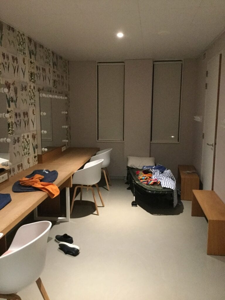 Gisteren waren we in Floralis in Lisse. Het is het oude veilinggebouw, het oudste bollenveilinggebouw ter wereld, ternauwernood gered door er na een grondige verbouwing een theater/bioscoopbestemming aan te geven. We kregen er een staaltje gastvrijheid voorgeschoteld dat zijn weerga niet kende. Het ontbrak ons werkelijk aan niets. Bij aankomst stond de man die Floralis van de sloop gered heeft ons buiten al op te wachten. Er was een parkeerplaats gereserveerd met een rood koord tussen twee verchroomde statieven. Wij waanden ons een ogenblik sterren. De gastheer week niet van onze zijde en benadrukte hoe geweldig het was dat wij de moeite hadden genomen naar Lisse af te reizen. We voelden geen enkele behoefte dat te relativeren omdat dat ongepast leek gezien de inspanning die men leverde het ons naar de zin te maken. Wat we drinken wilden? De maaltijd was goed verzorgd. Vegetarisch is nog niet de standaard, waarmee ik bedoel te zeggen dat nog steeds niet de vleeseter om vlees moet vragen, maar de vegetariër om geen vlees. De maaltijd was met liefde bereid en smaakte navenant. Na het eten, ik was misschien niet de gezellige causeur die men zich van mij had voorgesteld, maar in deze voorbereidingstijd is concentratie cruciaal. Om u even te verlossen van de gedachte dat wij een luizenleven hebben, hieronder een foto van de omstandigheden waarin ik voor de voorstelling een uiltje heb moeten knappen. Maar daarover valt de organisatie niets te verwijten. Na afloop kregen we nog een feestelijke bos bloemen mee.