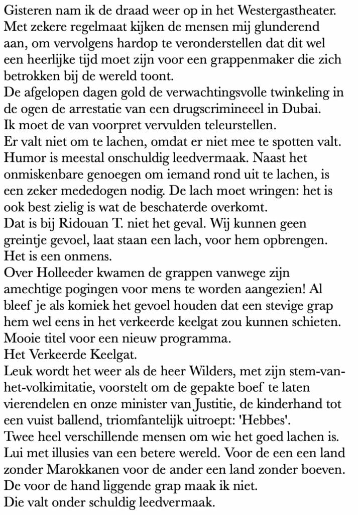 Onze (die van het gezin De Jonge jaren 50) eerste auto was een tweedehands kever. Kenteken TK 23-16. Oom Jan een rondborstige confectionair, jongste broer van mijn moeder en Mercedesrijder ging, toen mijn vader hem trots de nieuwe aanwinst toonde, enigszins wiegend op de treeplank ter bestuurderszijde staan die daarop afbrak. We waren diep gekwetst: Oom Jan was een nouveau riche patser. Gisteren was ik in Leusden in De Tuin. We waren er nogal vroeg. Zelden heb ik mijn auto zo dicht bij het podium kunnen parkeren. Ik ben vergeten te vragen waarom men tot die naam besloten had. Natuurlijk een tuin kan klein zijn, maar menig hovenier kan zodanig met ruimte woekeren dat een overvloed aan geur en kleur de argeloze waarnemer aangenaam verrast. Het theatertje was een gribus, een onhandig ingerichte fietsenstalling met kringloopmeubilair. De kleedkamer was een belediging. Een ruimte waar een aan een kruisverhoor onderworpen verdachte onmiddellijk doorslaat om er maar weer weg te kunnen. Ik probeerde er wat te rusten. Vluchtend voor de vragende blik waarmee een vrijwilliger je aan kan kijken, die je laat voelen dat je hem nooit voldoende eer zal geven voor zijn onbaatzuchtigheid en bovendien nog eens manifest maakt dat veel van je collega’s wel in staat zijn lekker te gaan zitten beppen bij een kop koffie waar de suiker en melk met tegenzin in gaan.Ik ga schaamteloos voorbij aan de liefde en inzet waarmee mensen in hun vrije tijd proberen in een vijandig cultureel klimaat een podium te bieden aan beginnende artiesten en een mogelijkheid scheppen voor de lokale bevolking om in eigen omgeving een voorstelling te beleven. Ik ben een oom Jan.