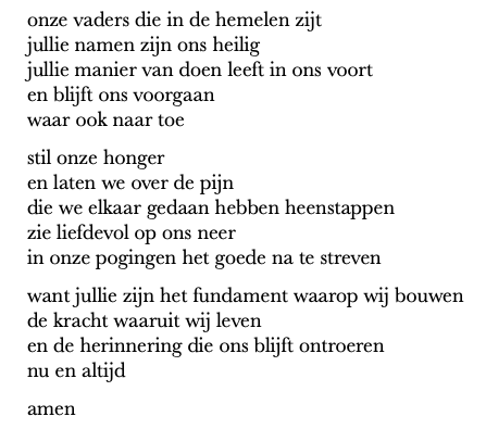 Hoe is het met dat vertrouwen gesteld? In onszelf, in de ander en het systeem waarin wij leven. Kan ik de vraag Mag ik er zijn? met een volmondig ‘ja!’ beantwoorden, tegelijk beseffend dat dat ‘ja!’ kan pas volmondig zijn als de ander ook volledig instemt met mijn aanwezigheid op deze aarde. Elkaar vertrouwen.