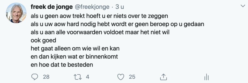 Een advocaat van het Metropole Orkest, waar ik ooit Parlando mee maakte, belde: hij wilde weten of wij grof geld verdienden aan de vertoningen op You Tube? Ik vertelde hem dat ik juist mijn half jaarlijkse afrekening binnen had: 27 euro ! Ook hier weer zo’n voorbeeld van enorme geldstromen die allemaal richting zee gaan in plaats van er droge gebieden mee te irrigeren. Om nog maar te zwijgen van Google en Amazon.