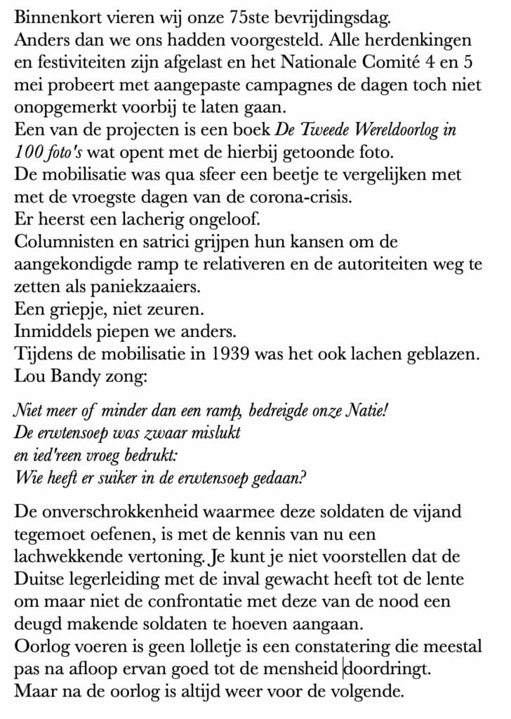 Ik die zoëven van de ene emotie in de andere gevallen was, krijg van de bezorger van die indrukken te horen dat het wel eens uit zou kunnen zijn met de pret. Welke pret ? Het weer, beste mensen. Het mooie weer . In dat onvolwassen, om er eens een Ruttiaanse kwalificatie tegenaan te gooien, toneelstukje aan het eind van ieder journaal wordt nog altijd kwijlend gerept van ‘mooi weer’. Dan moet ik steevast denken aan zonnige dagen uit de eerste wereldoorlog met dertigduizend doden.