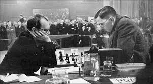 Na lekker veel gespeur op het internet kwam ik terecht in de Engelse vertaling van de biografie van Euwe, waar het verloop van de match integraal te lezen is. De onlangs overleden Alexander Münninghoff is de auteur ervan. Hij beschrijft meeslepend het gevecht tussen een keurige 34 jarige niet belijdend protestantse, met de SDAP sympathiserende leraar wiskunde aan de Amsterdamse meisjes HBS en een negen jaar ouder ex-Russische officier in het leger van de Tsaar die zich na de revolutie tot Fransman laat naturaliseren. Geniale intuïtie tegen gedisciplineerde ratio.