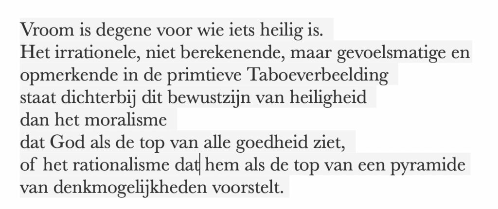Het primitieve taboe is daarom zo belangrijk omdat het het wezen van de religie in de kiem in zich draagt. Söderblom (Zweeds godsdienstwetenschapper begin vorige eeuw) zegt terecht dat het wezenlijkste van de religie niet het Godsgeloof is – er zijn zowel primitieve als culturele religies die deze overtuiging niet hebben -, maar het bewustzijn van een ander gebied, een dualiteit in de werkelijkheid. Het bewustzijn van de tegenstelling tussen prof aan en heilig. Men kan zichzelf niet vroom noemen als men geen beeld heeft van het heilige.