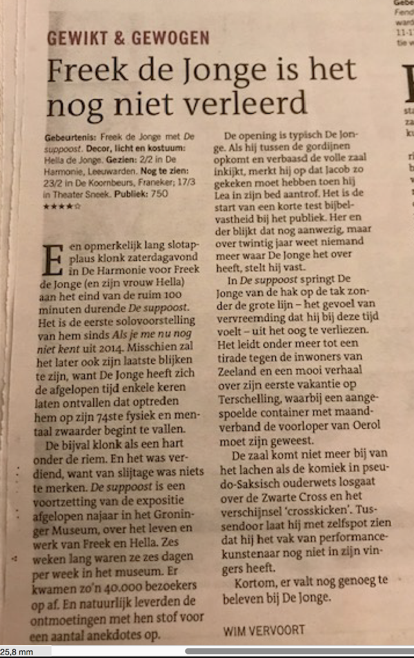 Een opmerkelijk lang slotapplaus klonk zaterdagavond in De Harmonie voor Freek de Jonge (en zijn vrouw Hella) aan het eind van de ruim 100 minuten durende De suppoost. Het is de eerste solovoorstelling van hem sinds Als je me nu nog niet kent uit 2014. Misschien zal het later ook zijn laatste blijken te zijn, want De Jonge heeft zich de afgelopen tijd enkele keren laten ontvallen dat optreden hem op zijn 74ste fysiek en mentaal zwaarder begint te vallen.