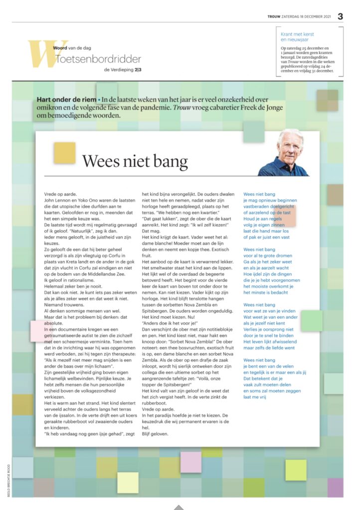 Freek de Jonge maant u: Wees niet bang (Trouw 18 december)