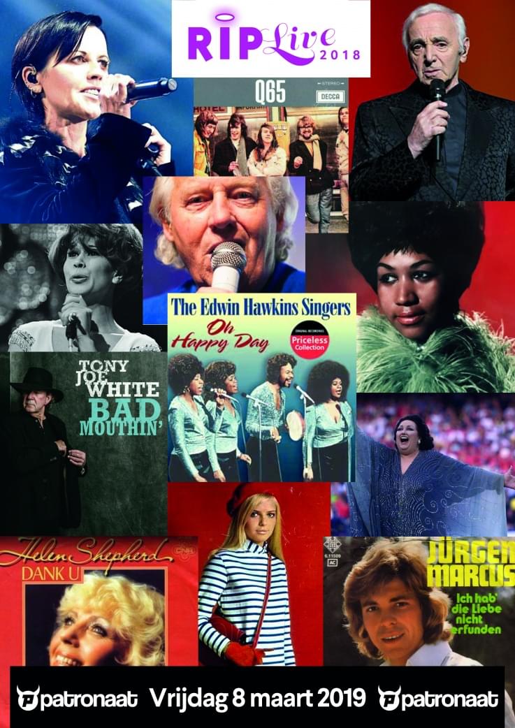 Na twee succesvolle edities belooft ook RipLive 2018 een mooie ode aan de muzikale grootheden te worden. Op vrijdag 8 maart treedt in het Patronaat in Haarlem een aantal artiesten om nummers van o.a. Aretha Franklin, Charles Aznavour, France Gall, Avicii, Jurgen Marcus, Tony Joe White, Hugh Masekela, Dolores O’Riordon (The Cranberries), Joop Roelofs (Q65) ten gehore te brengen.