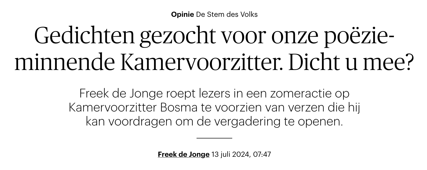 Freek de Jonge roept lezers in een zomeractie op Kamervoorzitter Bosma te voorzien van verzen die hij kan voordragen om de vergadering te openen.