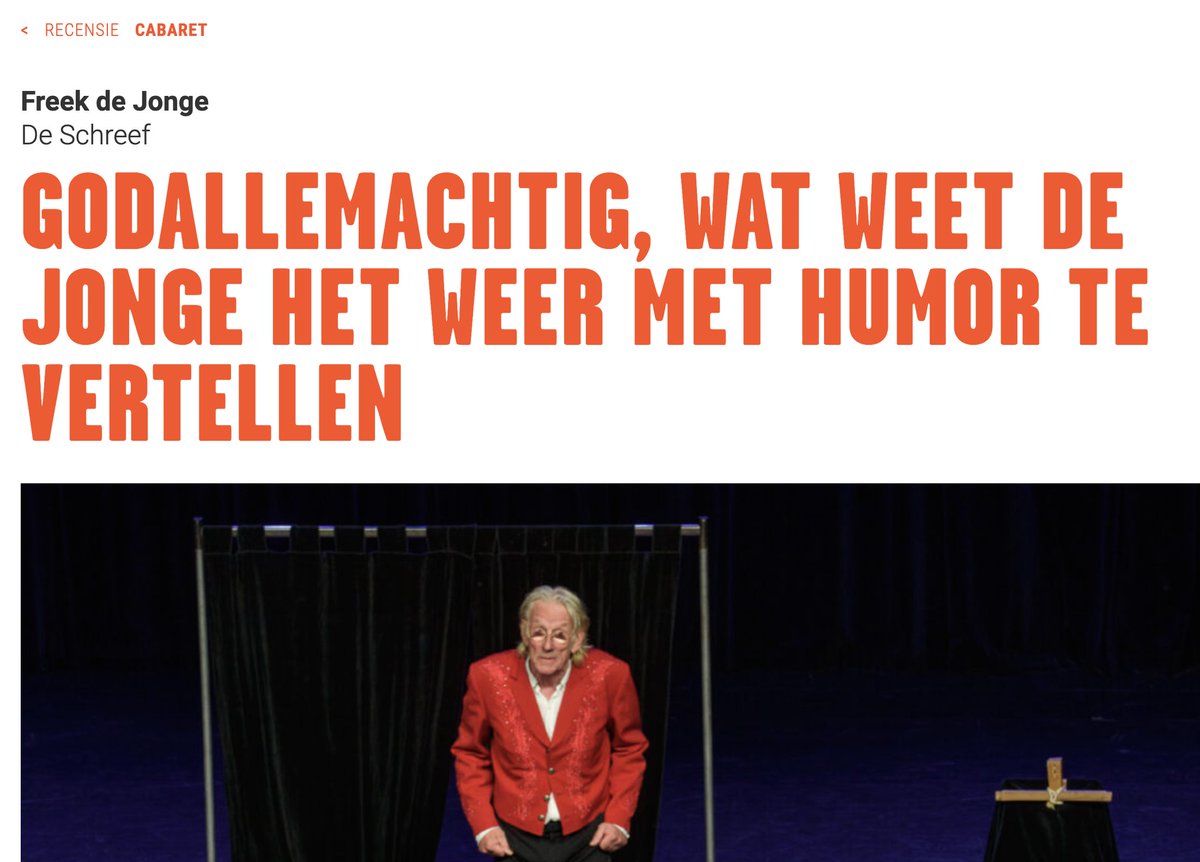 Het publiek van Freek de Jonge is sinds Neerlands Hoop en zijn eerste spectaculaire solo’s met hem meegegroeid. Daarom zitten er nu voornamelijk mensen in de zaal die moeiteloos de namen van de zangeresjes kunnen oplepelen die Nederland hebben vertegenwoordigd op het Songfestival in de jaren vijftig en die ook precies weten wat Fanny Blankers Koen als cadeau kreeg nadat ze met vier Olympische gouden medailles terugkwam uit Londen in 1948. De Jonge stelt zichzelf daarom cynisch de vraag: ‘Wordt er gelachen omdat ik geestig ben of zielig?’ Het antwoord is natuurlijk duidelijk. Freek de Jonge is de GOAT op zijn terrein en daar is niets zieligs aan.