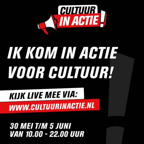 Cultuur in Actie! is een ketendemonstratie van 30 mei t/m 5 juni 2020 van 10.00-22.00 uur waarmee aandacht wordt gevraagd voor het belang van de culturele sector.