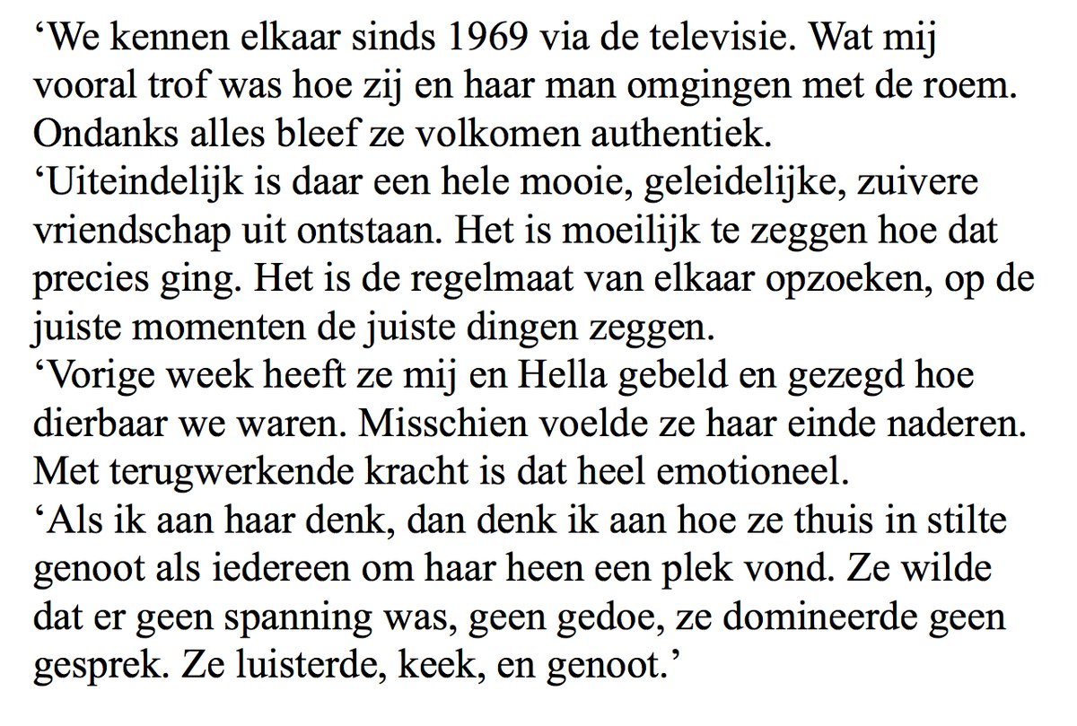 ‘We kennen elkaar sinds 1969 via de televisie. Wat mij vooral trof was hoe zij en haar man omgingen met de roe.m. Ondanks alles bleef ze volkomen authentiek. Uiteindelijk is daar een hele mooie, geleidelijke, zuivere vriendschap uit ontstaan. Het is moeilijk te zeggen hoe dat precies ging. Het is de regelmaat van elkaar opzoeken, op de juiste momenten de juiste dingen zeggen. Vorige week heeft ze mij en Hella gebeld en gezegd hoe dierbaar we waren. Misschien voelde ze haar einde naderen. Met terugwerkende kracht is dat heel emotioneel.