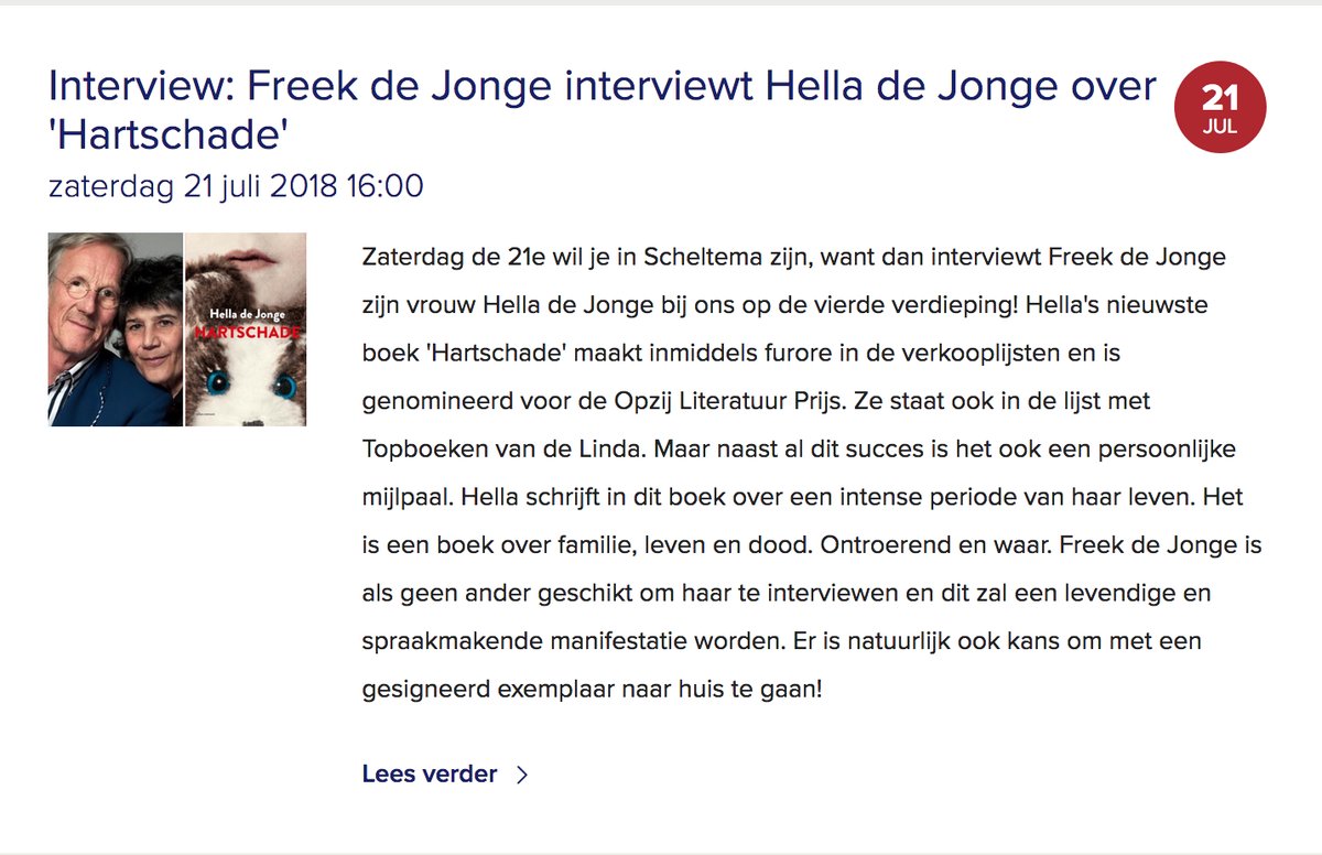 Zaterdagmiddag 21 juli spreek ik bij Boekhandel Scheltema Amsterdam met Hella…