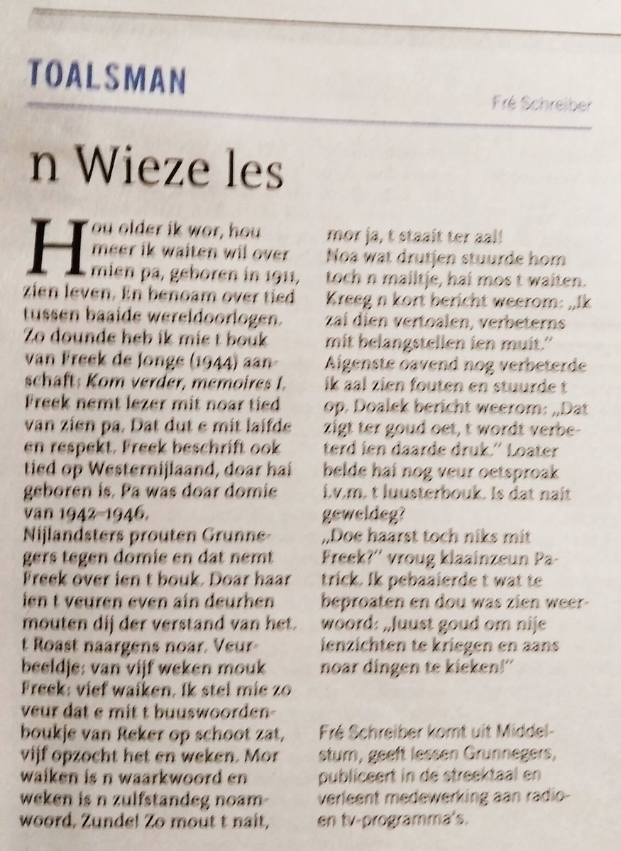 Column van Fré Schreiber in het Dagblad van het Noorden. (Mocht u de foto willen lezen: er is niets mis met uw ogen!) Lees de column hier.