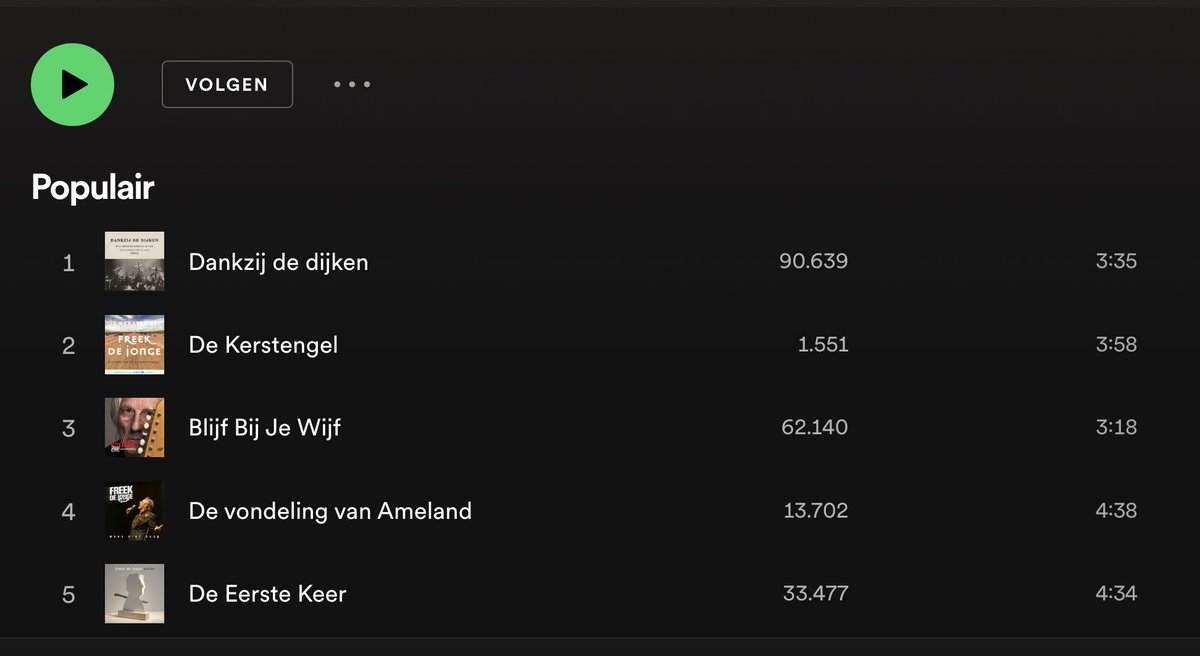 Hitlijstjes Spotify en You Tube Opmerkelijk: De Kerstengel Spotify ivm Kerstmis en de oorlog in de wereld Leven na de dood You Tube waarschijnlijk ivm de regel Wat kon Seedorf nou gebeuren Toen hij van elf meter schoot