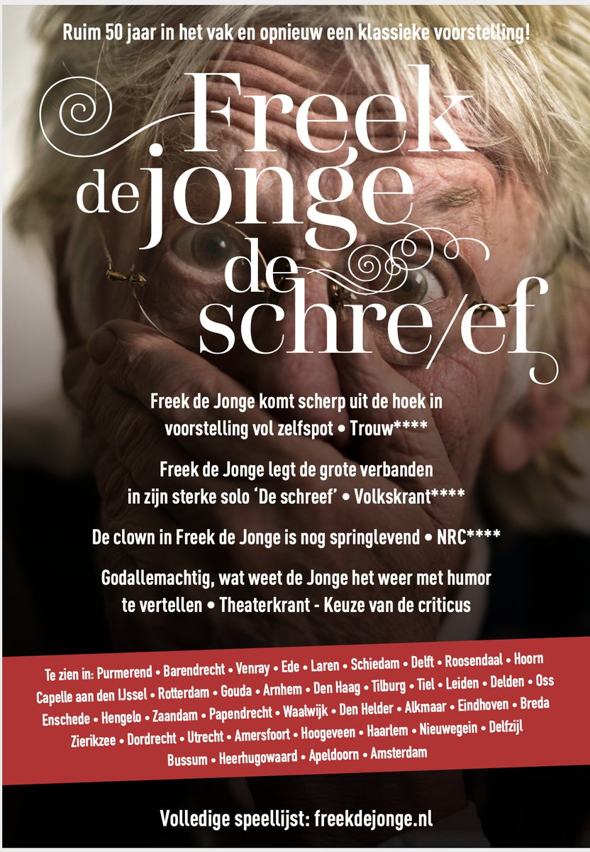 Beste mensen in het hele land! Mijn vorige tweet is niet helemaal geland, denk ik. De door pers en publiek bejubelde voorstelling De Schreef gaat nog 6x, waarvan 5x reeds uitverkocht is. Er zijn nog 30 plaatsen in Apeldoorn! Grijp uw (laatste) kans!