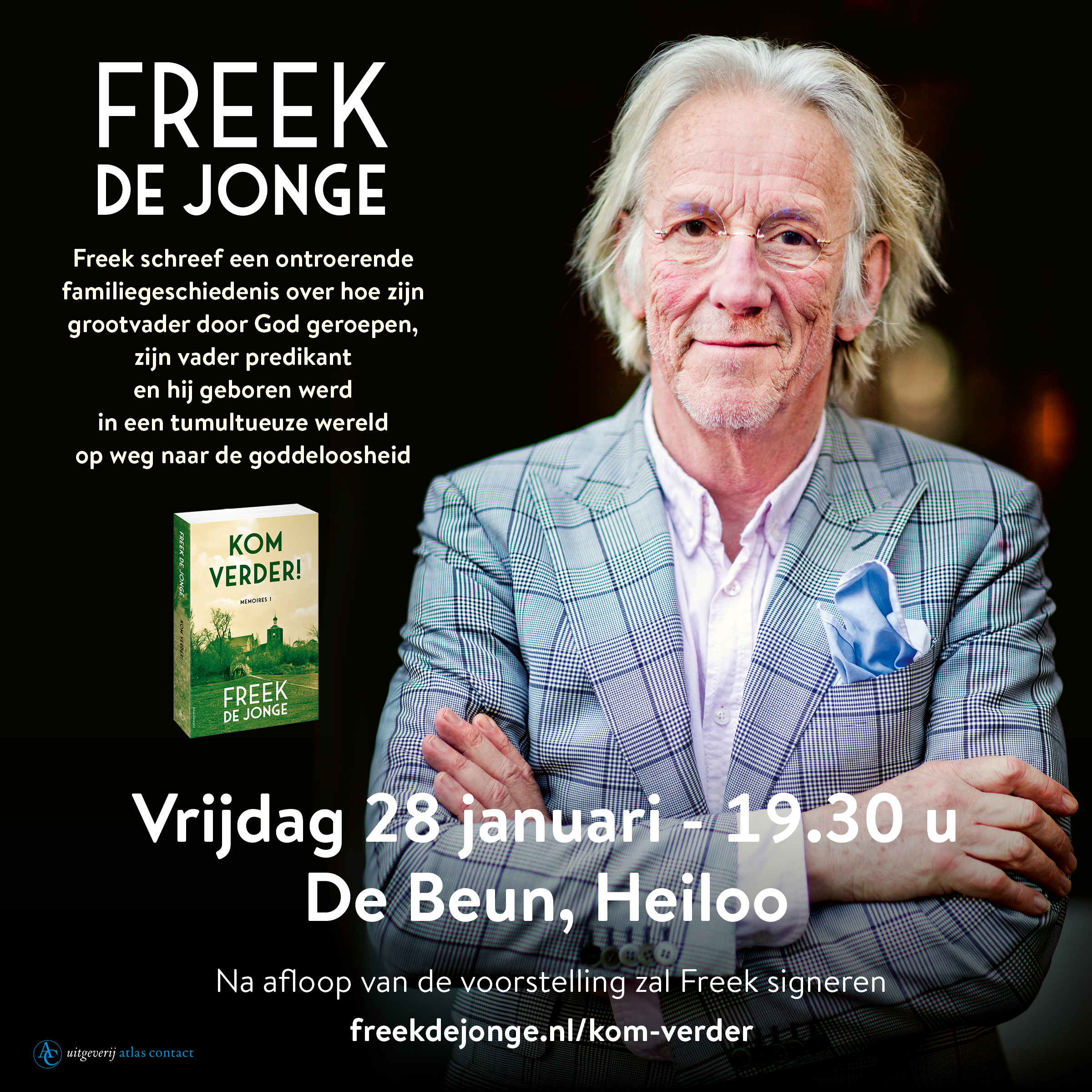 Freek vertelt, leest voor en gaat met het publiek in gesprek over zijn boek ‘Kom verder!’ dat over de coming of age van zijn vader gaat.