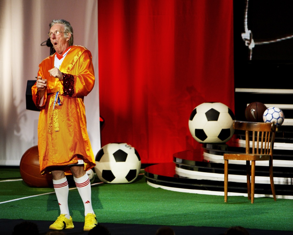 Eigenlijk is het altijd zo gebleven. Hij is 64, maar wanneer hij in sportkloffie en met een bal in handen op het podium staat, is hij weer gewoon 8 en balverliefd – daar hoeft hij weinig aan te spelen.’ (Bart Jungmann en Bert Wagendorp in de Volkskrant, 22 november 2008)