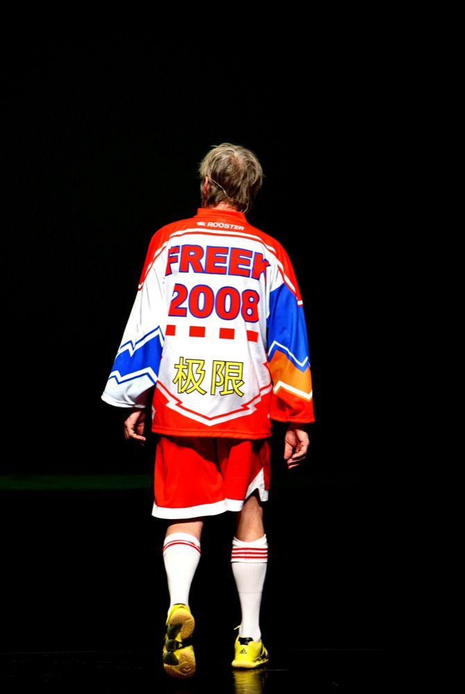 Hij is tijdens De Limiet gekleed in een rood-wit-blauw-oranje voetbaltenue, aanvankelijk nog bedekt door een feloranje badjas. Op de rug van het shirt staat Freek 2008 en voorop, in het geel, staat De Limiet in Chinese tekens. Naar zijn weigering om de boycot van de Olympische Spelen in China – een initiatief van collega-cabaretier Erik van Muiswinkel – te ondersteunen, verwijst hij slechts terloops. Wel komt hij nog een aantal keren op de mensenrechtenkwestie terug, onder meer via beelden van Jan Peter Balkenende op staatsbezoek en een verhaal, met hilarische uitweidingen, over een toespraak van Erica Terpstra. De basis voor beide verhalen zijn columns die hij tijdens de Olympische Spelen schrijft in het Algemeen Dagblad.