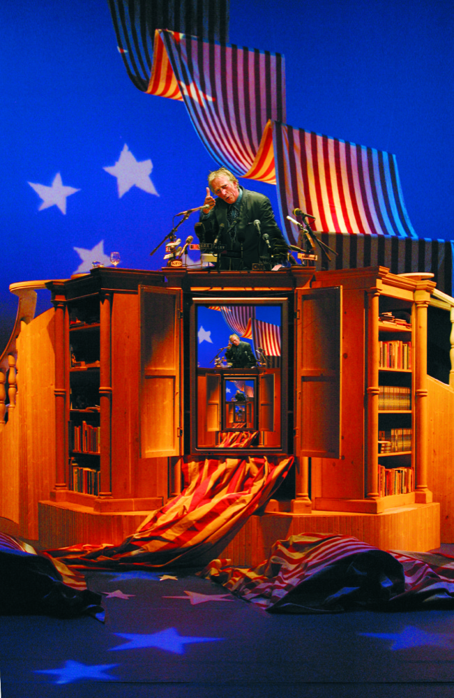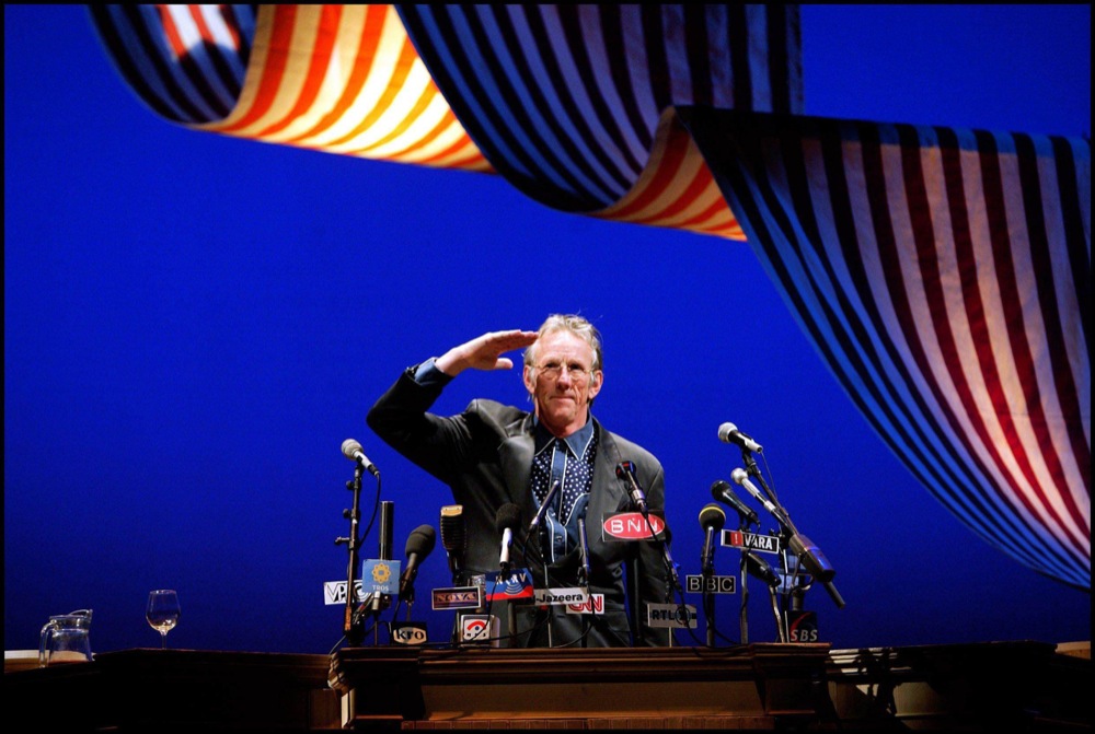 Op de kansel wordt hij omringd door lijsttrekkersportretten met veelbetekenend direct links en rechts van hem de foto’s van Wouter Bos (PvdA) en Jan Marijnissen (SP), de partijen waartussen hij als kiezer twijfelt. Maar aan het slot van de voorstelling neemt hij een grote bos rode rozen in ontvangst en zegt: ‘En ik was nog wel zo van plan geweest geen stemadvies te geven.’