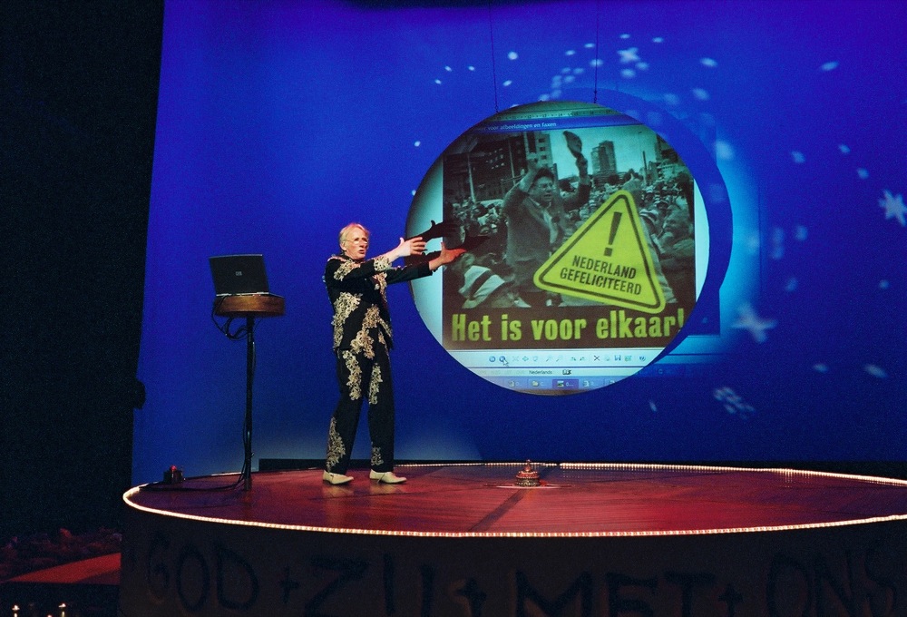 ‘Ik ben tot vijftien dingen gekomen, die ik in mijn hoofd verder heb uitgewerkt. Zie het als een simultaanschaker: je hebt vijftien partijen in je hoofd en doet met grote regelmaat een zet. Er komen monologen, waarvoor ik veel heb uitgeschreven. Maar ik ga bijvoorbeeld ook een masterclass doen met amateurtoneelspelers uit Amsterdam (…) en een musicalachtig geheel maken met Daniël Lohues en Cok van Vuuren.’ (NCRV-gids, 4 september 2004)