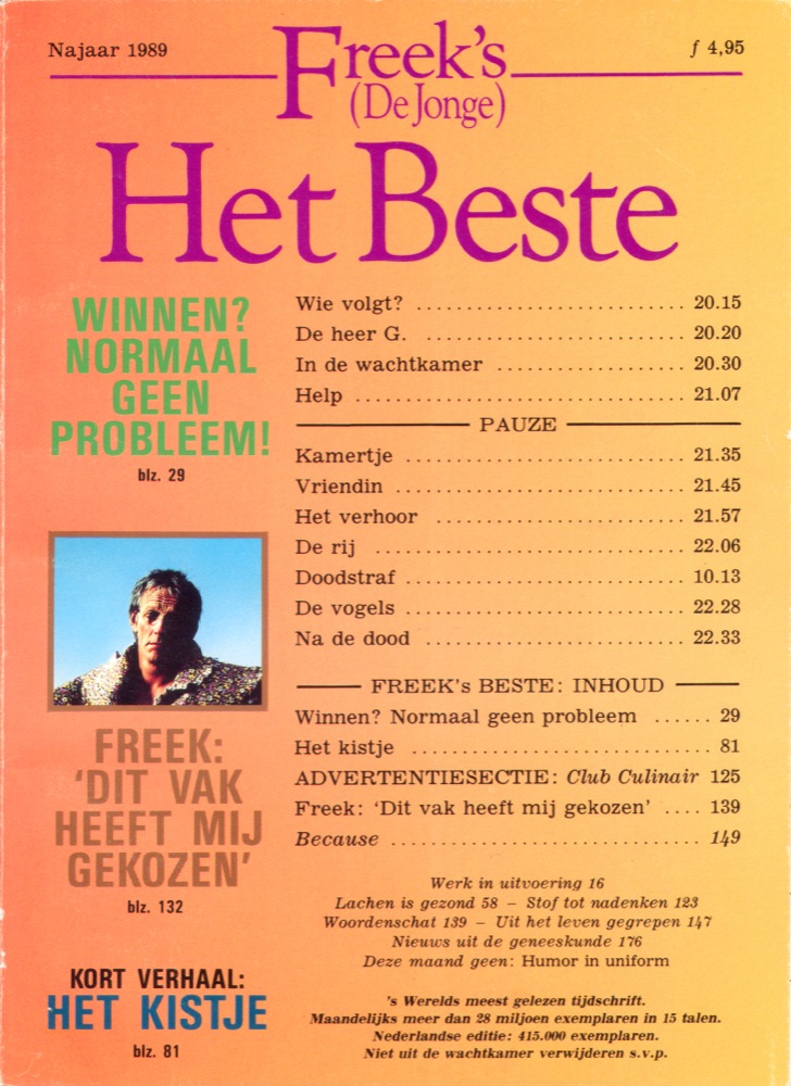 Uitgave in de stijl van het maandblad Het Beste van Reader’s Digest, zowel qua vormgeving (formaat, kleur, lettertype, opmaak) als inhoud. Net als (zoals de kaft meldt) ’s Werelds meest gelezen tijdschrift. Maandelijks meer dan 28 miljoen exemplaren in 15 talen. Nederlandse editie: 415.000 exemplaren bestaat Freek’s (De Jonge) Het Beste uit een bonte verzameling van korte verhalen, foto’s, grappen, cartoons, interviews en advertenties.