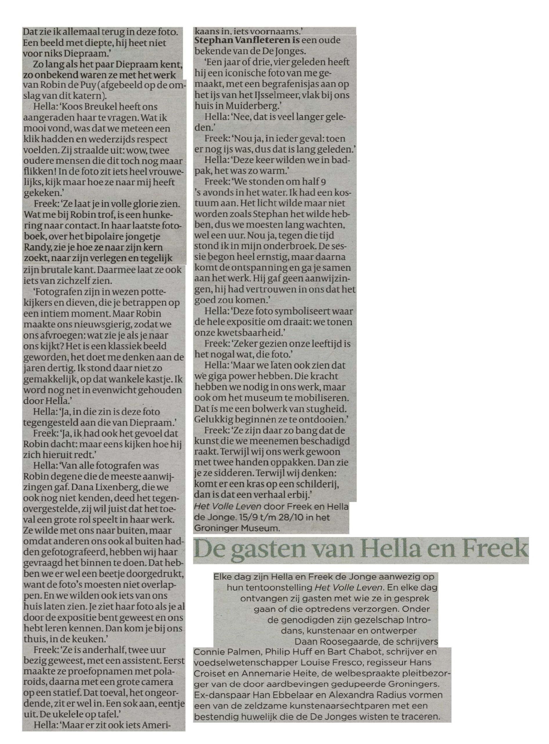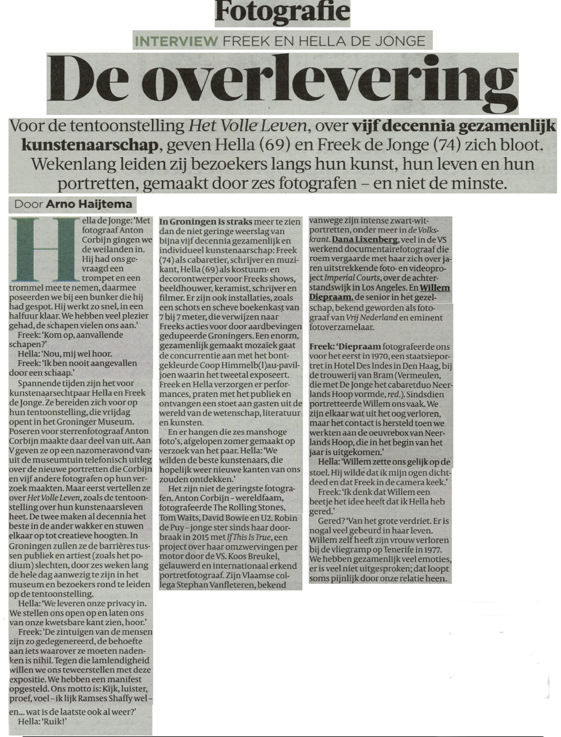 Voor de tentoonstelling Het Volle Leven, over vijf decennia gezamenlijk kunstenaarschap, geven Hella ( 69 ) en Freek de Jonge ( 74 )zichzelf bloot. Wekenlang leiden zij bezoekers langs hun kunst, hun leven en de portretten die zes fotografen van ze maakten. En niet de minste.