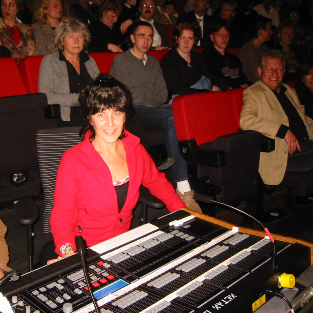 Hella achter de lichttafel bij 'De Kneep' in 2003