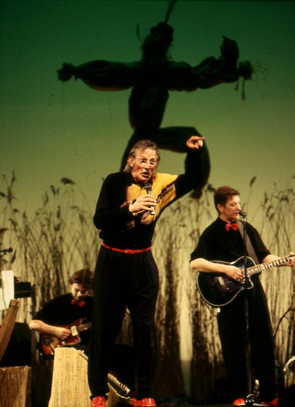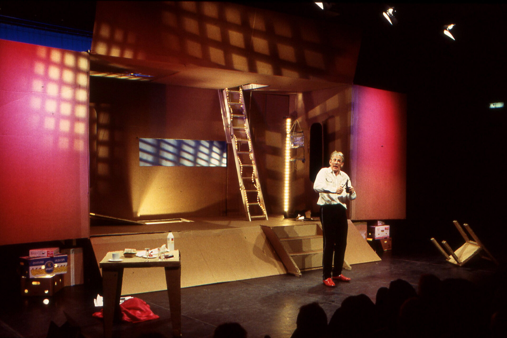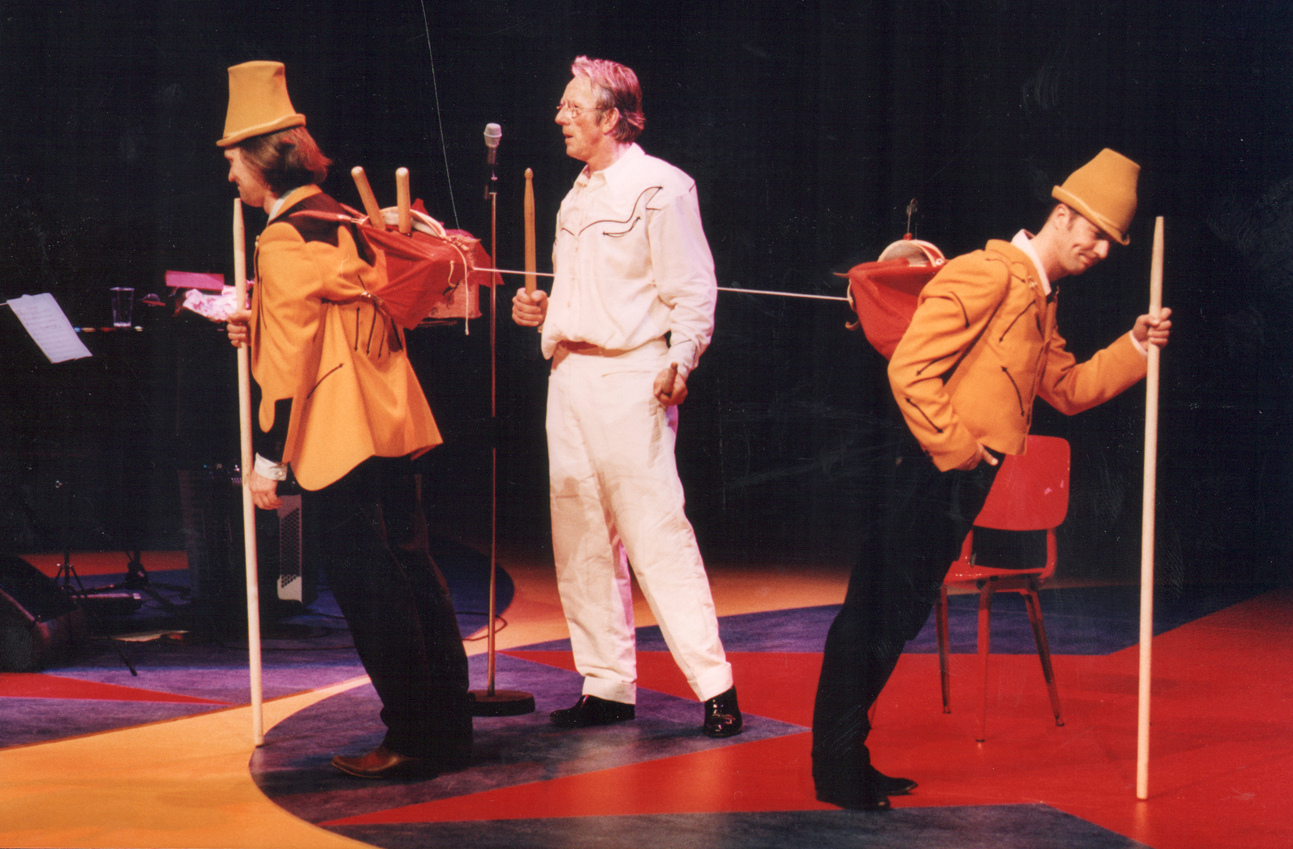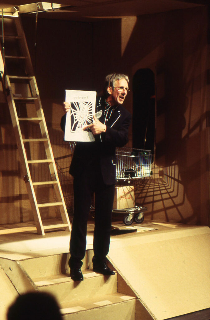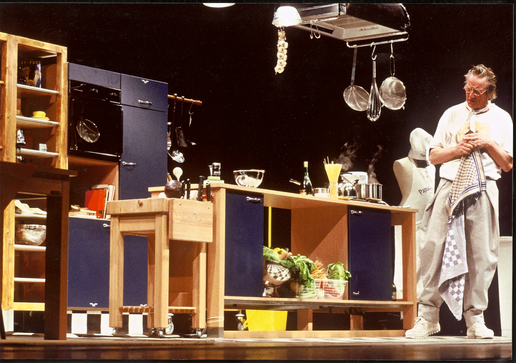 Kort voor de voorstelling brak Freek zijn been. Naar aanleiding daarvan verpakte Hella een deel van het decor in gips, net als het been van Freek. Foto: Marc Mildner