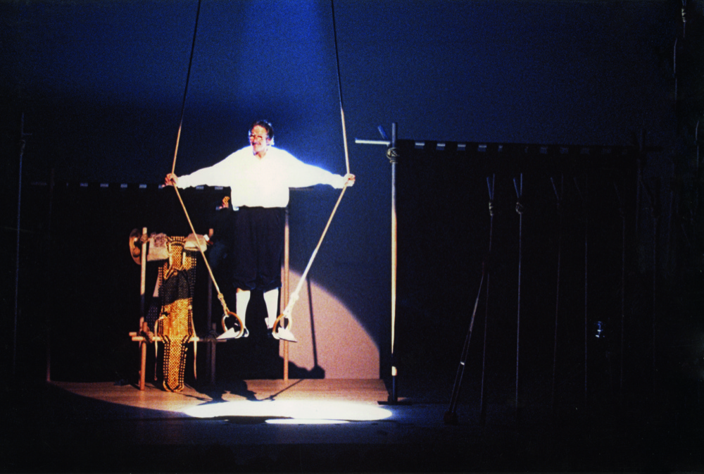 Maybe this is all meant to try us out. ‘Ook theater heeft betrekking op het bestaan’, stelt hij niet voor niets aan het slot, omdat het onwetendheid kan omzetten in inzicht. Daarmee legt hij direct verband met de leer van het boeddhisme. Deze en andere wijsgerige invloed laat zich ook herkennen in de Oosterse symboliek, zoals vormelijk sober, maar bijzonder doeltreffend weergegeven met onder meer een spiegel om zichzelf te zien en ringen die dienst doen als turnonderdeel (om ‘los’ te komen van de grond), maar evengoed als steungreep bij een gespeeld ritje in de tram: